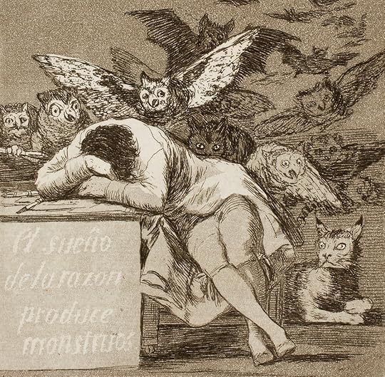 L’opera che esprime la fede illuminata di Goya nel valore della ragione, insidiata dai mostri dell’irrazionale. “Il sonno della ragione genera mostri”, (1797–98), Acquatinta e Acquaforte, cm 23×15,5 cm, Biblioteca National de Espana, Madrid. Francisco Goya ci indica il significato della sua opera: “La fantasia priva della ragione genera mostri impossibili: unita a lei è madre delle arti e origine di meraviglie. Quando gli uomini non ascoltano il pianto della ragione, tutto muta in visione“. La sua scelta “illuminista” depreca l’oscurantismo e dichiara che le superstizioni e l’assenza di autonomia di pensiero porterà gli uomini ad uno stato di brutalità e di paura. La ragione si unisca alla fantasia in un intimo connubio tra l’estro creativo e la razionalità. L’opera rappresenta una denuncia dell’oscurantismo, delle superstizioni, delle paure a non perdere mai il controllo della propria coscienza critica per non essere inghiottito dal buio della irrazionalità.