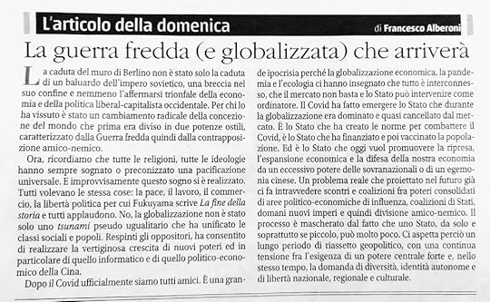 “La guerra fredda (e globalizzata) che arriverà”… Il Covid ha fatto emergere lo Stato che durante la globalizzazione era dominato e quasi cancellato dal mercato. E’ lo Stato che ha creato le norme per combattere il Covid, è lo Stato che ha finanziato e poi vaccinato … è lo Stato che vuol promuovere la ripresa, l’espansione economica e la difesa della nostra economia da un eccessivo potere delle sovranazionali o di una egemonia cinese. Un problema reale che proiettato nel futuro già ci fa intravedere scontri e coalizioni di Stati, domani nuovi imperi e quindi divisione amico-nemico. Il processo è mascherato dal fatto che uno stato, da solo e sopratutto se piccolo, può molto poco. Ci aspetta perciò un lungo periodo di riasseto geopolitico, con ua continua tensione tra l’ esigenza di un potere forte e, nello stesso tempo, la domanda di diversità, identità autonome e di libertà nazionale, regionale culturale.”