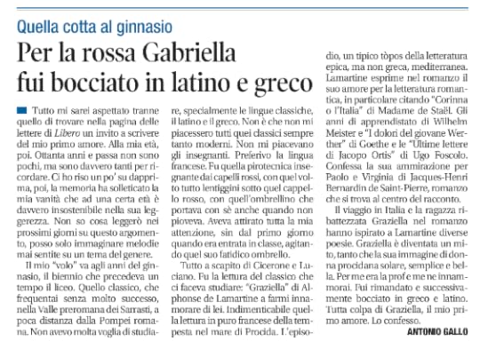 Per me era la prof e me ne innamorai. Fui rimandato e successivamente bocciato in greco e latino. Fui costretto ad emigrare altrove. Tutta colpa di “Graziella”, il mio primo amore. La mia prof. Lo confesso.