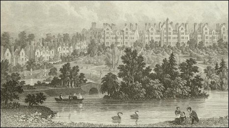 The engravings in this room include portraits of Mrs. Siddons, Mr. Burke, and Lord Onslow, as well as the Duke's print of the Chelsea pensioners reading the Gazette announcing the victory at Waterloo; and in the adjoining dressing-room, is a curious piece of work, made by the Duke's house carpenter and shown at the Exhibition in 1851, being the representation of Strathfieldsaye House, in the form of a picture, composed it is said of 3,500 pieces of wood. The Duke of Wellington thought so much of this picture that it used to hang during his lifetime in the dining-room.