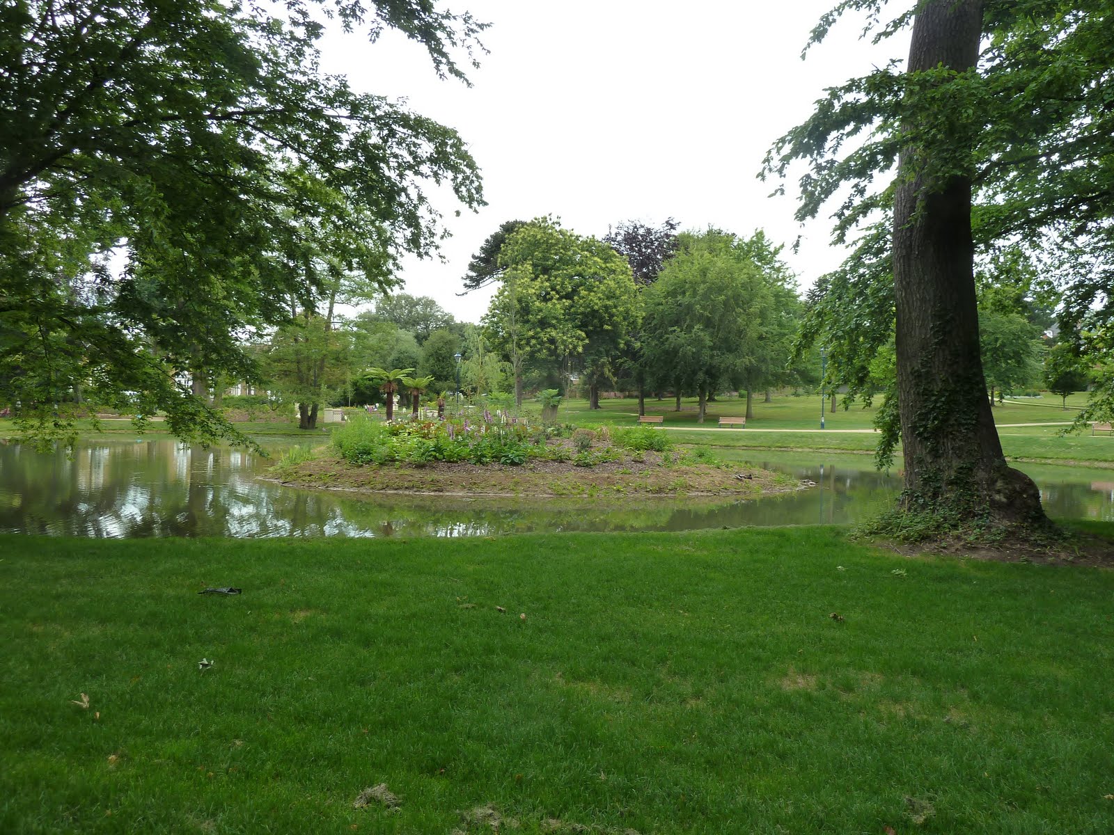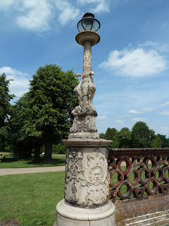 Below, one of the handsome lamps that grace the park.