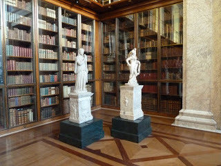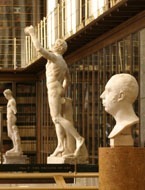 ancient statues in front of cases filled with books on loan from the House of Commons Library