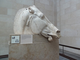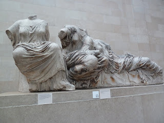 The Elgin Marbles were collected by the 7th Earl of Elgin from the ruins of the Parthenon in Athens between 1799 and 1812.  He had them shipped to London and after considerable Parliamentary controversy, the nation purchased them and placed them in the British Museum in 1816.  It's a long, convoluted story, interesting on many levels from the personal travails of Lord and Lady Elgin to the continuing arguments over their ownership. I don't  have the time or space to condense any of these stories at the moment.  I just enjoyed joining the hundreds of people studying the brilliant examples of ancient sculpture.