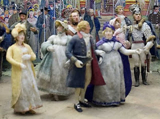 Hester Davenport blogged here about some of the most fascinating items in the collection, the miniature dioramas created in the 1950's by Judith Ackland and Mary Stella Edwards.  Below, a detail of Windsor during George II's Golden Jubilee in 1809, showing the princesses dancing at the local celebration.