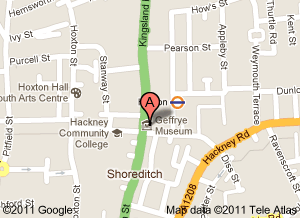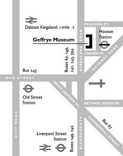 Above is a schematic map showing how to get there from Liverpool Street Station. The Geffrye stop is Hoxton Station. You won't have to walk if you don't want to do so. (Or, you could walk there, through that intriguing old East London area, and return to Liverpool Street by tube…)