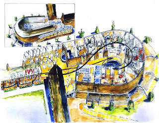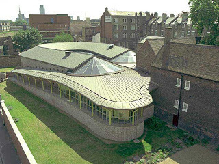 Below is a good aerial view of the 1998 extension to the Geffrye. You are seeing the windows of the restaurant that look out onto the new herb gardens.  If you could see further, there's a wall and beyond that, the new tube station. The church spire is St Leonard's, I believe, and you can just make out some of the tall office buildings (the famed Gherkin is one of them) in the environs of Liverpool Street.  Directly across from the museum is well-maintained council housing. The architectural firm responsible for the extension done in 1998 was Branson Coates Architecture.