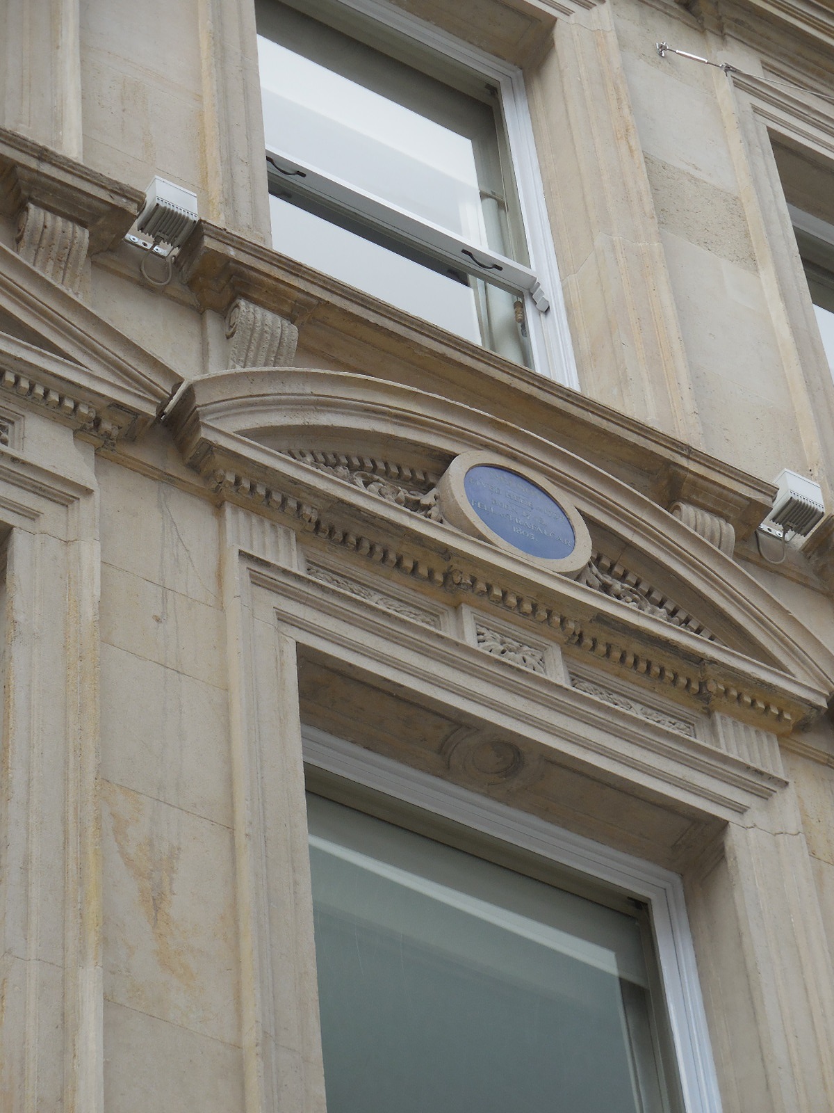 This difficult-to-read blue plaque is for Admiral Lord Nelson, who lived here at 103 New Bond street. It concludes, "Fell at Trafalgar, 1895."