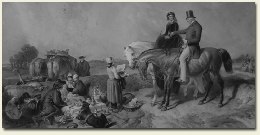 As immortalized in the paintings above, the Duke of Wellington did indeed return to the field of battle at Waterloo, often accompanied by prestigious guests. When he saw the Lion's Mound for the first time, he lamented, "They have ruined my battlefield." I don't think that the Duke objected to the Mound itself, but rather to the fact that much of the dirt needed for the Mound was taken from the famous ridge behind which Wellington had placed his troops at a critical point in the battle. Ordered to lay down, the massive lines of British troops could not be seen by the advancing French, who believed that they had managed to catch Wellington unprepared and that victory would soon be theirs. As the French cavalry advanced, Wellington bided his time until the very last moment, when it is said that he ordered, "Up, men and at them!" Suddenly, the French found themselves confronted by the Long Red Line, fully armed with weapons cocked. Wellington had studied the ridge long before the Battle ever began and came prepared to use it to his advantage should the opportunity arise. The ridge was integral to the British victory at Waterloo and the construction of the Mound had diminished the scale of the ridge. Thus, Wellington was perturbed.