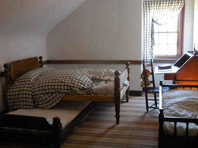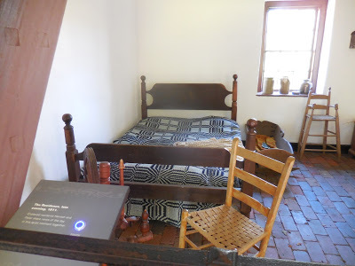 Adjacent to the kitchen is a room set up for a servant or a slave, above and below.