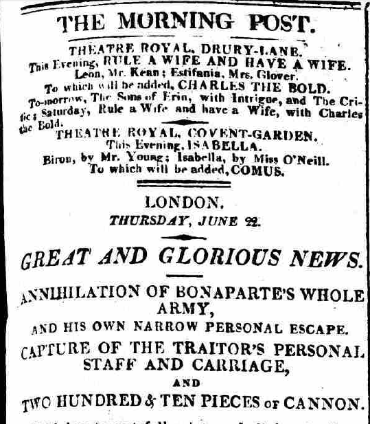 After completing the despatches and sending them off on June 19th, the Duke of Wellington returned to Brussels to see some of the wounded and report to the King of the Netherlands. British troops crossed into France June 21, as did the Prussians.