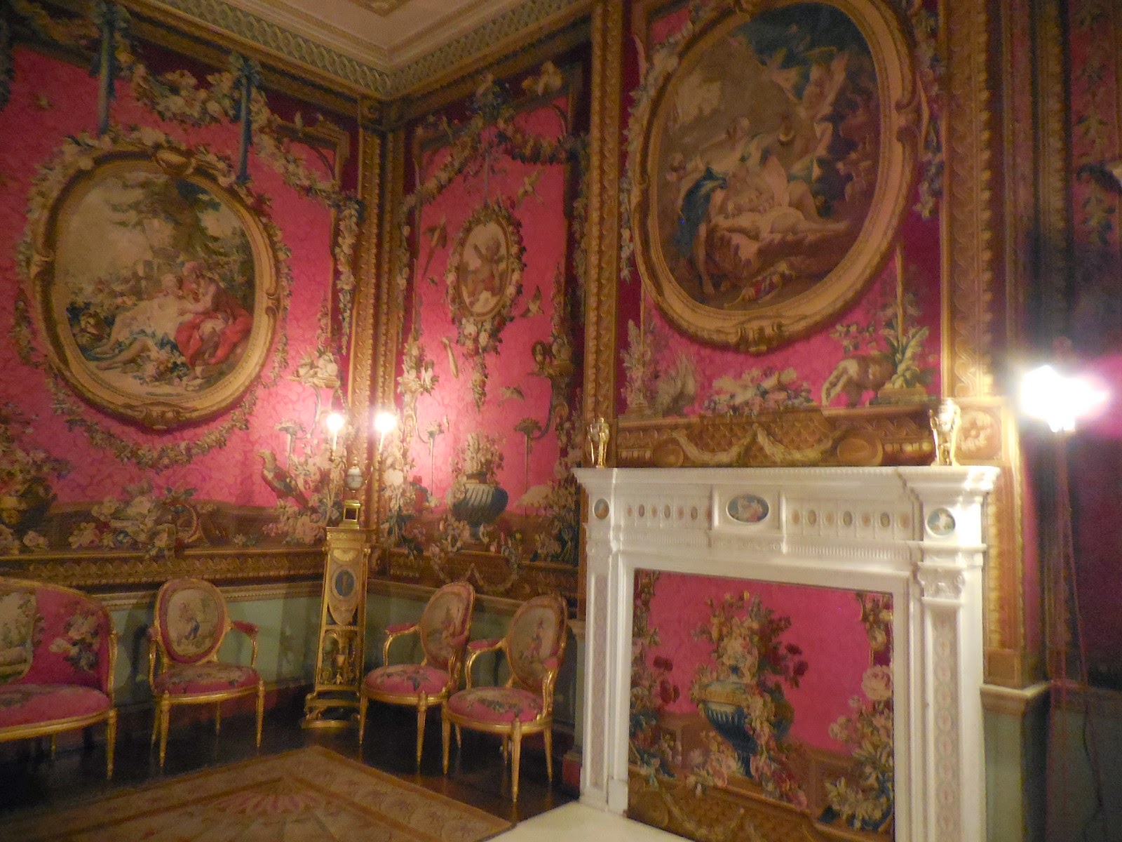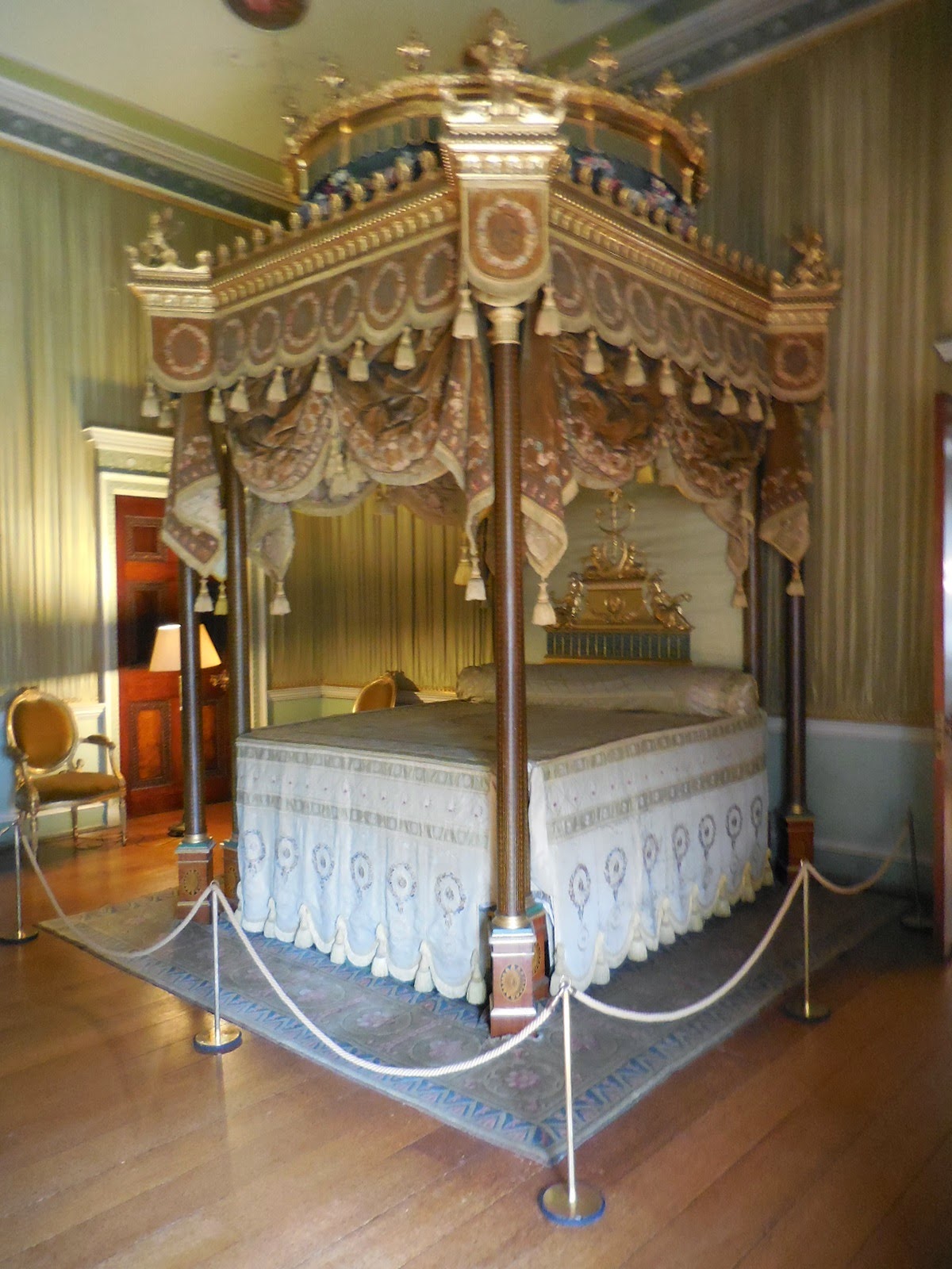 The furniture was built by Linnell and upholstered to match the deep rose background of the tapestries. Similiar tapestries in a drawing room designed by Adam can be seen at the Metropolitan Museum of Art in New York City, where the Tapestry Room from Croome Court in Worcestershire now resides. Read more about this room here. This is the ante-room to the State bedroom, which almost overwhelms the visitor. Imagine what it would be like to try to sleep in this bed.