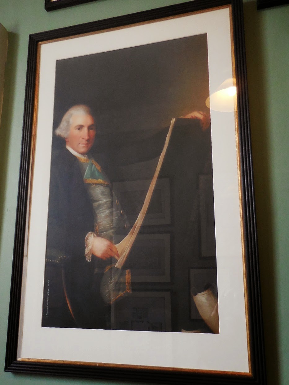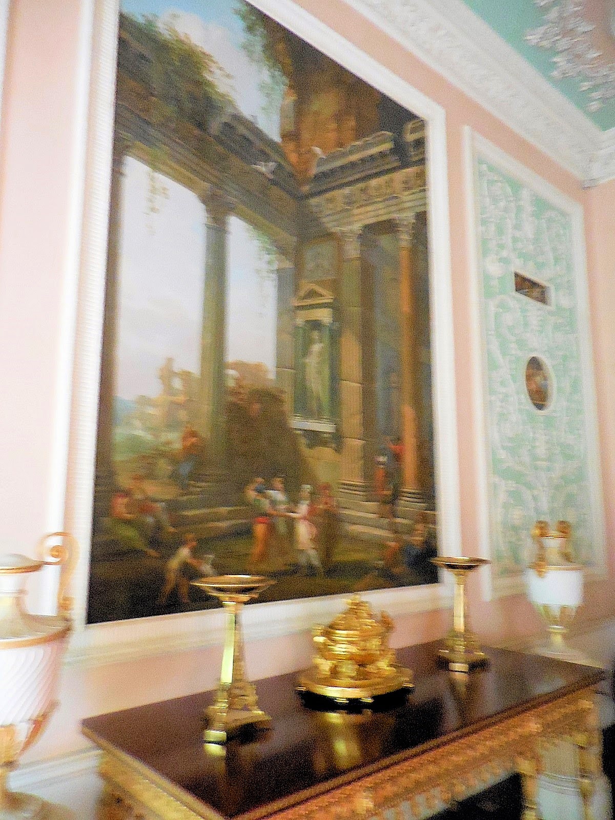 The NT guidebook quotes Agneta Yorke commenting on the sideboard "'magnificently furnished with plate, and under the Table was a Massy and large silver Cistern', reminding them of the fact that the Childs were goldsmith bankers and extremely rich." The painting, in this slightly blurry picture, is another of Zucchi's capricci of 1767, Turkish figures dancing among classical ruins.