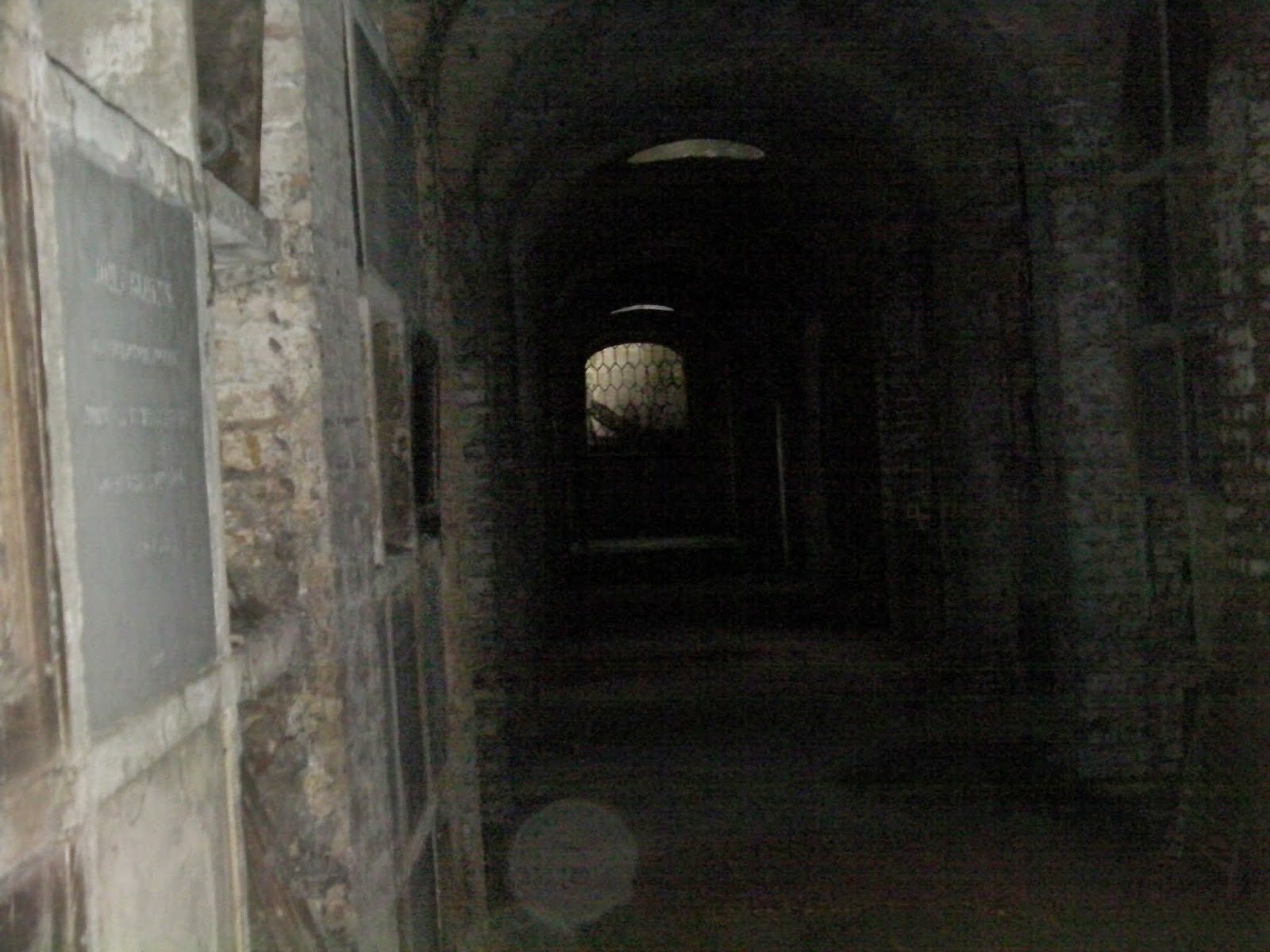 And here's one taken in better light that I swiped off the internet so that you'd have a better idea of the space we were in. As I said, we were nearly in the pitch dark, surrounded on all sides by sealed crypts. As you can see in the photo below, there are sky lights in the ceiling, but by 2014 the vegetation had grown over them, dimming the space further. It was so dark that I had to step in close to peer at the stones that were marking the individual graves.