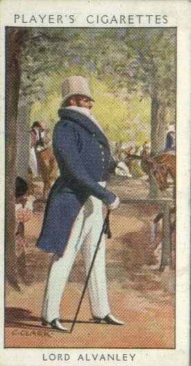 On behalf of Lord Alvanley, however, it may be added that about this date another story got abroad respecting him which redounds more to his credit . He and Lord Kinnaird were playing whist one evening, when, owing to some mistaken move in the game on the part of Lord Alvanley, Lord Kinnaird completely lost his self-control and abused his friend in the most violent manner. Lord Alvanley listened in silence to the torrent of denunciation, then, rising from the card table, observed very quietly, "Not being blessed with your Lordship's angelic temper, I shall retire for fear of losing mine!"Moreover, Marianne Stanhope, about the same time, makes mention of an instance of Lord Alvanley's good-nature which came under her notice. It appears that one of his greatest friends was an Irish dandy who, for long, went by the nickname of "King Allen" on account of his having achieved a unique position in the world of fashion. This monarch of the beau monde spent his days, as did others of his class, exhibiting his faultless clothes in fashionable resorts; and so wedded was he to this existence that he could seldom be persuaded to quit London even for the benefit of his health.
