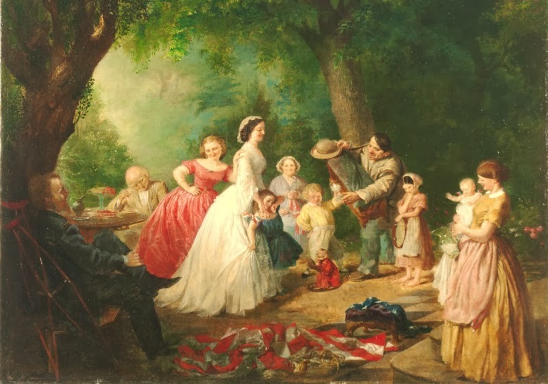 Lilly Martin Spencer was born in Exeter, England, to French parents; the family emigrated to the U.S. when she was 8 years old in 1830. Her husband, Benjamin Rush Spencer, married in 1844 in Cincinnati, devoted his life to her artistic career. Lily Spencer's popular paintings focused on daily life, particularly of women. After the Civil War, she was well known for depicting the results of the war and the changes it brought in the American family. In the scene above, the mother in white -- said to be a self-portrait -- and her daughters in red and blue assist the poor. The man at the left seems to be a wounded war victim. the painting is seen as m allegory of how women are repairing the war-torn nation.