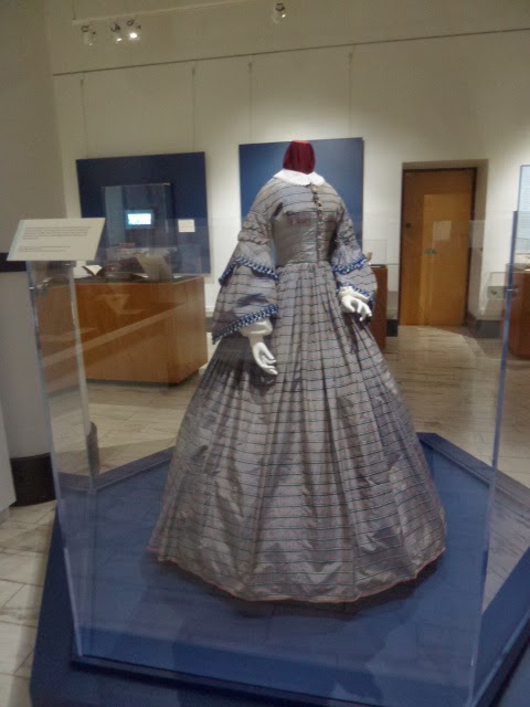 This Zouve-style silk dress worn by Sarah Cadwallader Logan Knowland, 1865-66, particularly interested me for the carefully stitched pleating and fine fabric. I find it interesting that military styles often influence women's fashions.