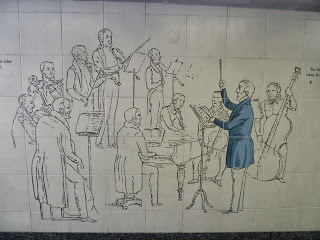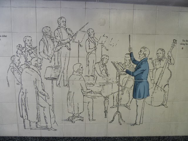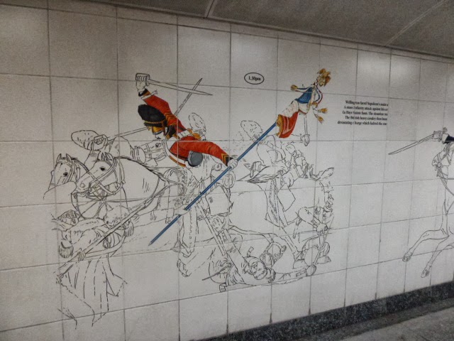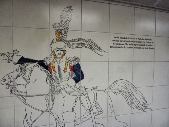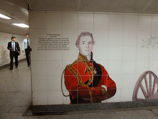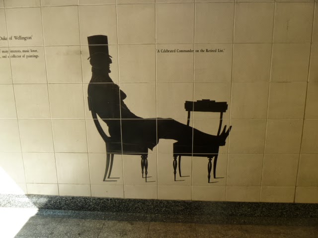 As I mentioned before, the Wellington Arch and the equestrian statue stand in the middle of a traffic circle, joined to the adjacent streets and the Hyde Park Corner Tube stop by underground walkways. The white tile walls are decorated with scenes of Wellington and his troops. Below, a few examples as we walked -- or I walked and Ed limped -- to visit Apsley House.