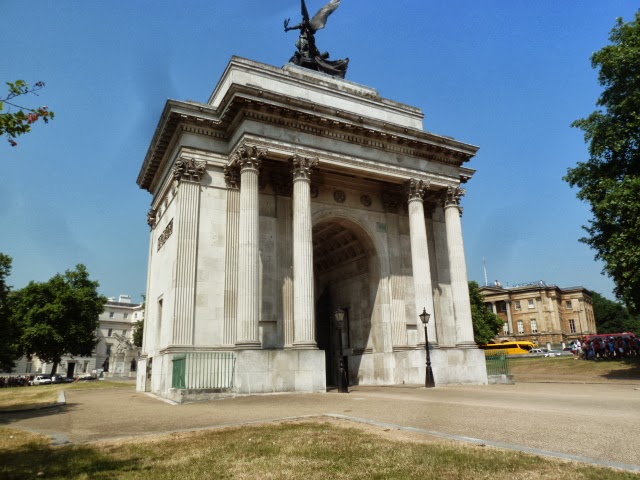 Wellington Arch; Apsley House at the far right Both the Wellington Arch (aka the Green Park Arch and the Constitution Arch) and the Marble Arch were affected by political arguments over cost, design and placement in the 19th century. Both were moved from their original positions and both stand relatively isolated in the middle of traffic circles surrounded by buses, autos, lorries and other noisy vehicles. Traffic too often trumps landscape. Whoops, soapbox again.
