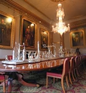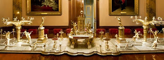 Who would leave such a wonder undusted?? The silver service is 26 feet long and three feet wide; it was presented to the Duke in 1816 by the Portuguese Council of Regency. Designed by D. A. de Sequeira, the service was made in the Military Arsenal in Lisbon from 1812 to 1816. The center group represents the Four Continents paying tribute to the armies of Britain, Portugal and Spain.