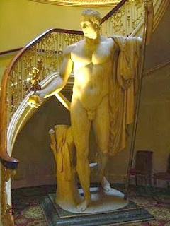 rosewood showcases of china and plate Me: "All these gifts were given to the Duke of Wellington, many by the governments of the Allies, in gratitude for his victory over Napoleon." Ed: "Oh." Me: "He received tureens and candelabra of silver, shields, vases, china services for hundreds, centerpieces and epergnes, not to mention elaborate military decorations...blah, blah, blah..." Ed: "Oh." Me: "Swords, and scabbards, medals and jewels, etc. etc...." Ed: "Can I go sit down again now?" Do you think he was a bit bored by the cases of china, silver and gilt? What I was really waiting for was his reaction to the Canova sculpture. We had traveled to Waterloo for the battlefield reenactment a few years before, and Ed was quite familiar with the popular images of Napoleon as short and stout. So when we came to the staircase, I looked for a reaction of shock -- and I was not disappointed.