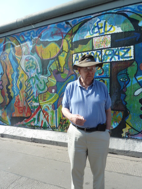 Ed stands at remains of the Wall, or a touristy replica -- opinions varied! Lots of walking in Berlin, through museums with very hard marble floors, more cobblestones, treks to see this and that, all wonderful but far apart. Feet suffering. Swollen. Shoes now too tight. Limping. After a few hectic days in crowded, lively Berlin, we flew to Heathrow.