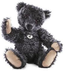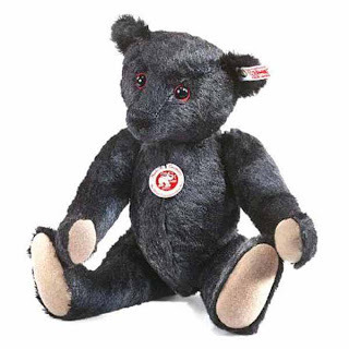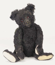 The bear above sold in 2001 at Christie's, London, for £12,925, the description read as follows: A rare Steiff black teddy bear with pronounced clipped muzzle, large black boot button eyes with red felt backing, black stitched nose, mouth and claws, swivel head, jointed elongated limbs with cream felt pads and hump --16in. (40.5cm.) high, circa 1912