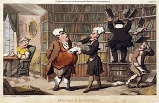 Dr. Syntax heads to Paternoster Row, site of the bookseller’s office. Eventually he meets the man: "My errand was to bid you look With care and candour on this Book; And tell me whether you think fit To buy, or print, or publish it? The subject which the work contains Is Art and Nature's fair domains; 'Tis form'd the curious to allure; — In short, good man, it is a Tour; With drawings all from nature made. And with no common skill displayed;:Each house, each place, each lake, each tree, These fingers drew — these eyes did see." Though at first unwilling, a letter from Syntax’s mentor changes the bookseller’s mind: “His Lordship here expressly says Your work transcends his utmost praise; Desires the printing may commence, And he'll be bound for the expense. The book will sell, I have no doubt, I'll spare no pains to bring it out: A work like this must not be stinted. Two thousand copies shall be printed.” …Thus (such are this world's odds and ends) Though foes they met — they parted friends.