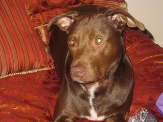 Now, as you know, I pride myself on reporting this trip exactly as it happened. There was a pit bull on the train. Which now allows me to segue neatly into this photo of our granddog, Coco, the pit bull. Who believes with all his heart that he's a Yorkshire terrier and who is constantly trying to climb onto my lap. But I digress . . . . .