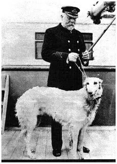I found this picture on Pinterest, with the following caption: "Captain Edward Smith of the Titanic and his beautiful Borzoi which was saved." After re-pinning it, I'd experience a meloncholy pang every time my eye fell upon the photo as I scrolled through my board. Finally, I decided to find out more about the Captain's dog and turned to the internet for a little instant research gratification. It transpires that others had taken an interest in the Titanic's four legged passengers, as I found a wealth of material on the subject. I soon discovered that there were thirteen dogs onboard the Titanic, not including the dog pictured above, which was in fact a Russian Wolfhound. From Today.com's website -
