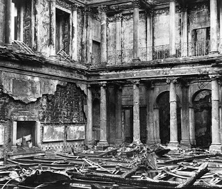 It is remarkable that the Assembly Rooms exist today at all. During WWII, the historically important English cities of Exeter, Bath, Norwich and York were targeted by the Germans in a series of targeted attacks known as the Baedeker raids. From Wikipedia: The Baedeker raids were conducted by the German Luftwaffe's Luftflotte 3 in two periods between April and June 1942. They targeted strategically relatively unimportant but picturesque cities in England. The cities were reputedly selected from the German Baedeker Tourist Guide to Britain, meeting the criterion of having been awarded three stars (for their historical significance), hence the English name for the raids. "Over the weekend of 25-27 April 1942, Bath suffered three horrifying reprisal raids, from 80 Luftwaffe planes which took off from Nazi occupied northern France. As the city sirens wailed few people took cover, even when the first pathfinder flares fell the people of Bath still believed the attack was destined for nearby Bristol. During the previous four months Bristol had been hit almost every night, and so the people of Bath did not expect the bombs to fall on them. "The first raid struck just before 11 pm on the Saturday night and lasted until 1 am. The enemy aircraft then returned to France; refuelled, rearmed and returned at 4.35 am. Bath was still ablaze from the first raid, making it easier for the German bombers to pick out their targets. The third raid, which only lasted two hours but caused extensive damage, arrived in the early hours of Monday morning. The bombers flew low to drop their high explosives and incendiaries and then returned to rain the streets with machine-gun fire. 417 people were killed, another 1,000 injured. Over 19,000 buildings were affected, of which 1,100 were seriously damaged or destroyed including 218 of architectural or historic interest. Houses in the Royal Crescent, Circus and Paragon were destroyed and the Assembly Rooms burnt out." This is how the Tea Room looked after the Baedeker raids, or Bath Blitz, in April 1942.