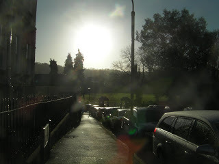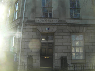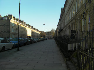 "Don't tempt me." On my way out, I met the owners of Duke's Hotel, Chris and Carol Cameron. Neither had been in the hospitality business before, but had just weeks ago purchased the hotel and moved to Bath with their two daughters. They are the epitome of good innkeepers - helpful, warm, welcoming and full of concern for myself and Hubby. Upon hearing that Hubby was now down with the cholera, both assured me that we need only to ask for anything and they would provide it, no matter what time of day or night. Thus assured, I went out the door and into the sunlight. Yes, it was mildly sunny, a nice change from grey skies and pouring rain. You'll see that I was feeling a bit better by the fact that I actually took photos. Here's one of Great Pulteney Street.