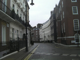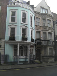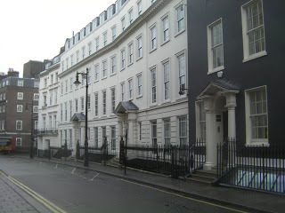 In the early morning quiet, with the streets deserted, it's easy to imagine a carriage drawing round the corner or the sound of a service door closing upon a maid who has just taken in a delivery. A horse may whinny in the distance, someone may shout in the mews two streets away, while the aristocracy sleep warm in their beds, having turned in just a few hours ago after a night of Regency revelry . . . . But back to the house . . . . .
