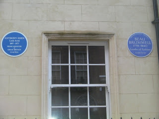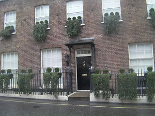 Let's pay homage to the Beau first, shall we? It's only fitting. Taking a right onto Queen Street, we stroll up to the top and make a left onto Charles Street, keeping on until we come to the corner of Chesterfield Street, where Beau Brummell lived. Before we turn in, though, take in the door across the street. And the elaborate railings. And the shrubbery on the terrace. And the pediments.
