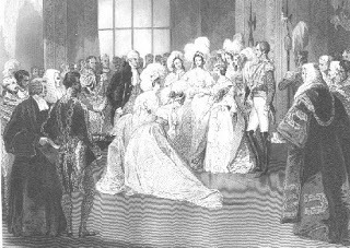 REGULATIONSTO BE OBSERVED ATHER MAJESTY'S DRAWING ROOMS. All ladies attending Her Majesty's Drawing Rooms are requested to bring with them two cards, with their names legibly written thereon—one to be left with the Queen's page in attendance in the Presence Chamber, and the other to be delivered to the Lord in Waiting, who will announce the name to Her Majesty. And those ladies who are to be presented are informed, that it is absolutely necessary that their names, together with the names of the ladies who are to present them, should be sent into the Lord Chamberlain's Office two clear days before the Drawing Room, in order that they may be submitted for the Queen's approbation, it being Her Majesty's command that no presentation shall take place, unless the name of the lady presenting, together with that of the lady to be presented, shall appear on the card delivered as before directed, corresponding with the names sent into the Lord Chamberlain's Office; and it is especially requisite that the Ladies who present others, should be actually present at the Drawing Room. One card must be left with the Queen's Page, in the Presence Chamber, and another be delivered to the Lord-in-Waiting, who will present the Lady to the Queen.At a Birthday Drawing Room, no presentations take place; but, nevertheless, each Lady and Gentleman, who proposes to attend, should send a card to the Queen's Lord Chamberlain a few days before the holding of the Drawing Room Afterwards, when you attend, take care that your carriage arrive at the Palace before two o'clock. You should be provided with two cards, to be delivered as before mentioned, one to the Queen's Page in the Presence Chamber. Afterwards you enter Queen Anne's Chamber, where you wait until the door is opened at the end of the room, looking down from the fire-place. You should enter within the rails near the fire-place, and go in procession to the Anti-Drawing Room. Ladies carry their trains on the left arm until they come near to Her Majesty, when the train is dropped, a card delivered to the Lord-in-Wailing, who will announce the Lady's tide or name, when she makes a graceful courtesy to Her Majesty, and then retires. The Ladies who attend Drawing Rooms will be pleased to observe that there is an established regulation with regard to their dresses. Court Etiquette requires that they should not appear in hats and feathers, or turbans and feathers, but in feathers and lappets, in conformity with the established orders.It must be particularly observed, that no persons are permitted to remain in the Throne Room, having passed Her Majesty at the Drawing Room, but the Ministers and their ladies, the great Officers of the Household and their ladies, the Foreign Ministers and their ladies, and the Officers of the Household upon duty.