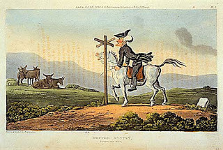 My introduction to The Tour of Dr. Syntax in Search of the Picturesque came from this old hand-colored etching. Though I don't remember when or where I found it, it must have been in a bin of prints at a London dealer -- one of several I like to visit when in Town. Something appealed to me and I bought it, brought it home and framed it. I look at it everyday in my office.