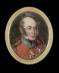 Also in the Royal Collection is this watercolour on ivory by Andrew Robertson (1777-1845), dated 1800. Purchased by Queen Victoria in 1880, it portrays Chantrey "Half-length, standing, facing slightly to the right, wearing a grey studio coat and dark blue waistcoat and holding a hammer, chisel and yellow dustcloth, beside his bust of George IV; grey-blue eyes, grey-brown hair; red curtains background."