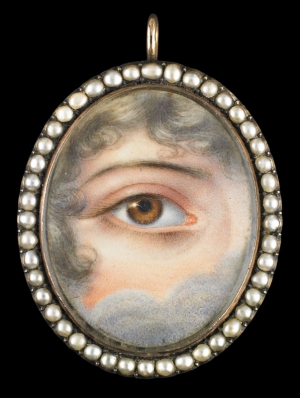 Gold oval pendant surrounded by seed pearls, ca. 1830. Brown right eye with clouds1 7/8 (with hanger) x 1 3/8 x 1/4 in.