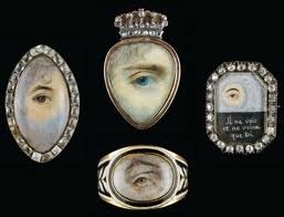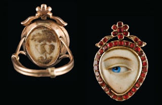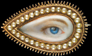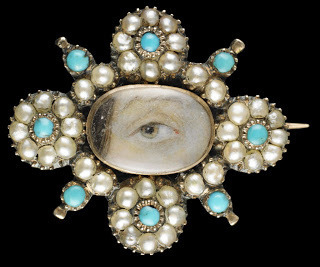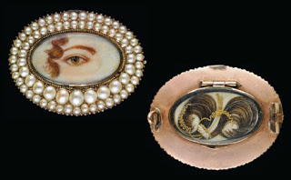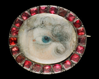 It amused me to note that one of the few lover's eyes that an be identified by its artist is by Richard Cosway (1742-1821) greatly celebrated in his day as a painter and a close friend of the Prince Regent, later George IV. And yet, this particular piece is one of very few that is not bejeweled, but instead decorated with paste (fake) red stones. Rather ironic, I thought.