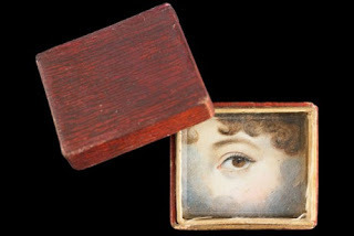 A patch box, a stick pin, the wallet, and the teacup -- what many uses have been fund for the lover's eyes. Nan and I discussed the fact that many of the eyes portrayed are from the left side, and we speculated on how such a choice could be made -- by the artist, the sitter or the person who made the commission?