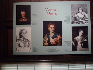 The exhibition is divided into several sections covering such subjects as Religious Writing, Love and Romance, and Families and Salons. Below, a panel celebrating poetry. In the center is Veronica Franco (1546-1591), a Venetian poet and courtesan.
