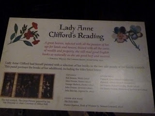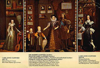 A reproduction of a triptych (attributed to Jan van Belcamp) showing Lady Anne Clifford on either side; in the center panel is Margaret Russell, Countess of Cumberland, and George Clifford, 3rd Earl of Cumberland, with their two sons, is on display.