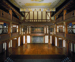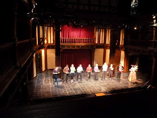 Below, a view of the Folger's theatre, without the gleeful group, but showing all its timbered glory. The theatre is also used for fully staged productions, literary and theatrical awards ceremonies, performances of the Folger Consort, and other activities.