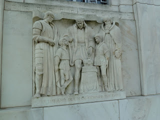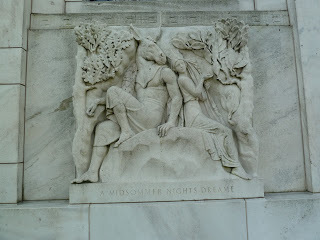 On the exterior of the building, scenes from Shakespeare's favorite plays are captured in white marble bas relief sculptures. Above, a Midsummer Night's Dream. Below, Richard III.