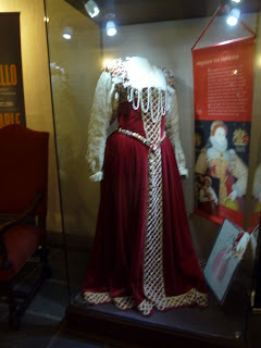 The above costume replicating the Elizabethan gown in the portrait was worn by actress Michael Learned in the 2003 Folger Theatre production of Elizabeth the Queen by Maxwell Adnerson (1888-1959). Ms. Learned required the assistance of a dresser to put on the costume which weighed more than twenty pounds.