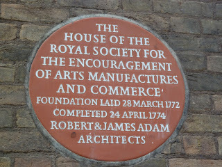 Below is the plaque placed on the building. The RSA is still an active part of British intellectual and scientific life with more than 27,000 fellows and frequent programs, many open to the public. Various other societies, such as the Royal Academy of Arts, is an 18th century spin-off (or whatever they called them in those days).