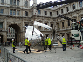 Above, workers install a large sculpture in the courtyard of the Royal Academy in 2009. Below, it is completely assembled.