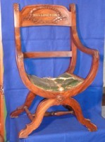 Discovered during a routine valuation morning at the Chipping Norton branch of Tayler and Fletcher, Auctioneer and Valuer Stephen Sheppard could not believe his eyes when a photograph of The Duke of Wellington Chair appeared before him. This fine regency period elm cross frame chair proudly proclaimed the name 'Wellington' in bold brass lettering to the top rail and carried a metal plate inscribed with the following inscription 'This chair is formed from a tree which grew on the plains of Waterloo, and under which the Duke of Wellington stood during a great portion of the day on which he achieved the most glorious of his many Victories. The wood was given to me by J G Children Esq., of The B. Museum, who purchased the entire tree of its proprietor E.V.U.'