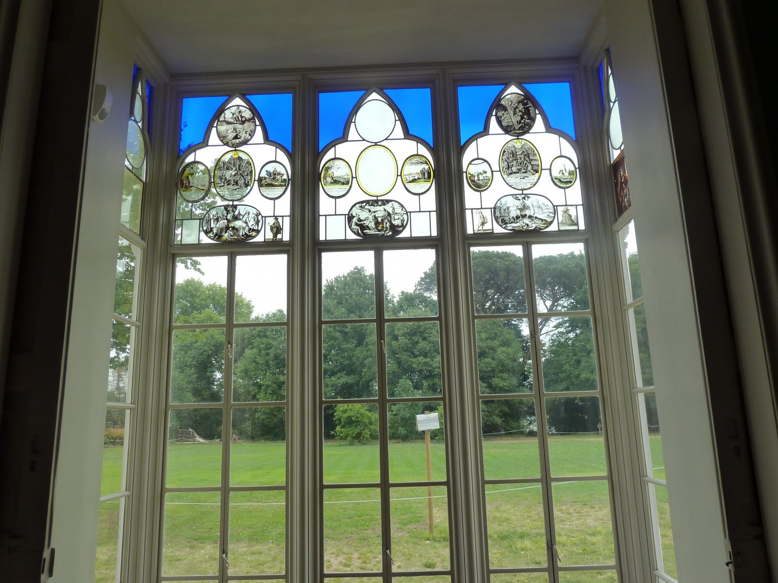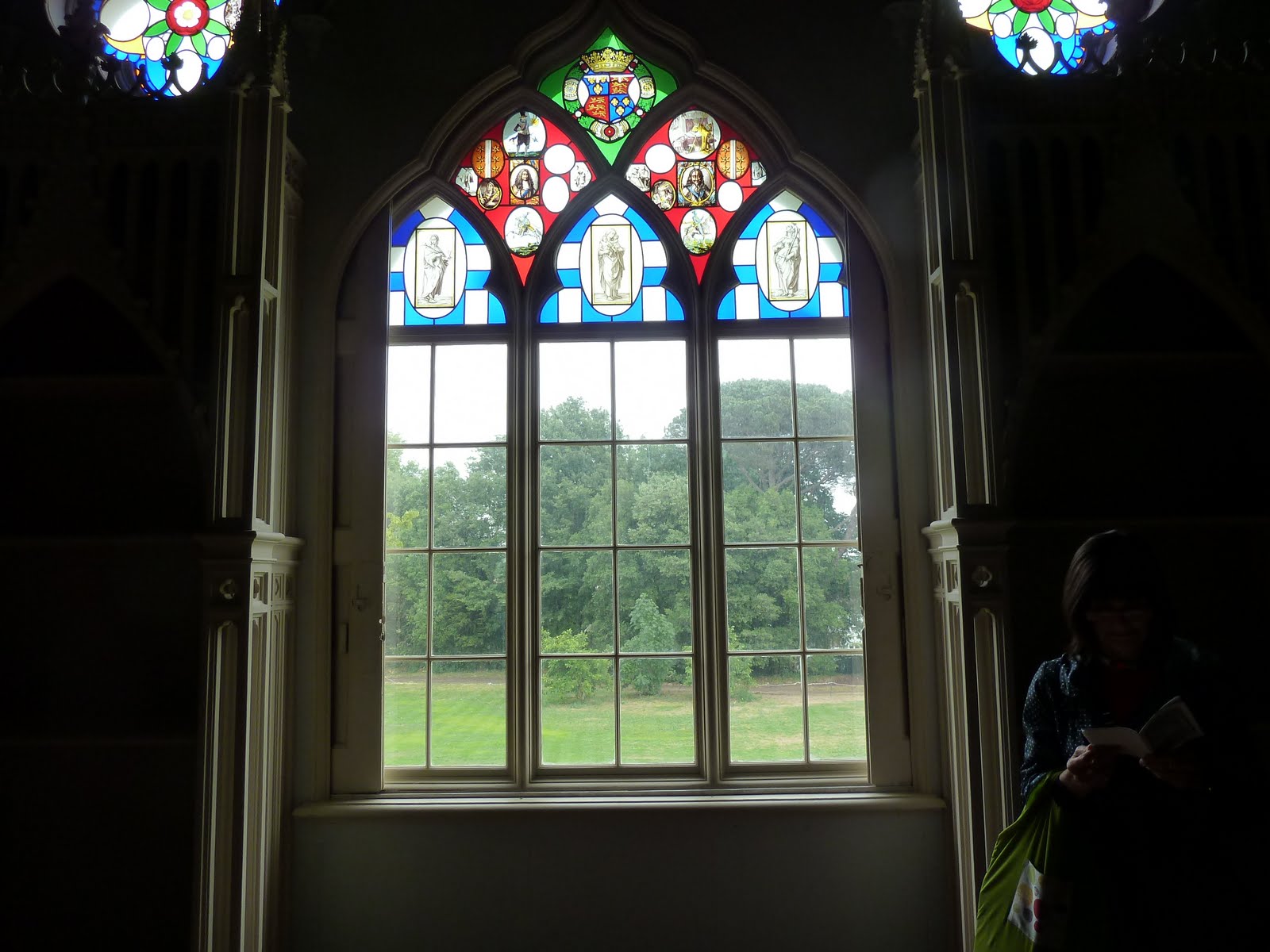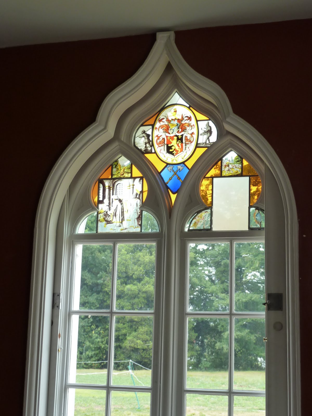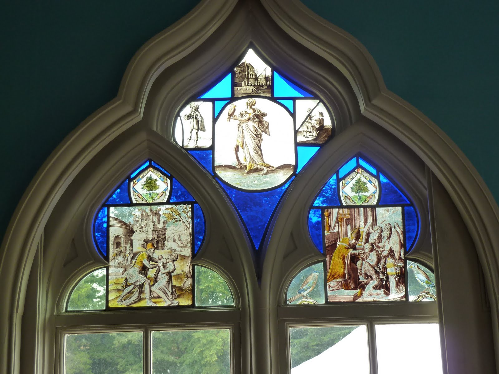 Below, I have arranged my photos in groups of architectural features. If you'd rather see each room, one by one, click here. More of the windows, incorporating Walpole's colorful collections of glass: