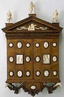 Above, a window, showing how Walpole incorporated his collection of Renaissance and older glass into his modern 18th century windows. Last year, in 2010, I was fortunate enough to visit the wonderful exhibition at the Victoria and Albert Museum in London: Horace Walpole and Strawberry Hill. The exhibition, also shown at the Yale Center for British Art, reassembled many of the objects Walpole have collected but which were dispersed in a multi-day sale in 1842. Below, a cabinet of miniatures and enamels made for Walpole and now owned by the V&A. Inside, it was full of his treasures.