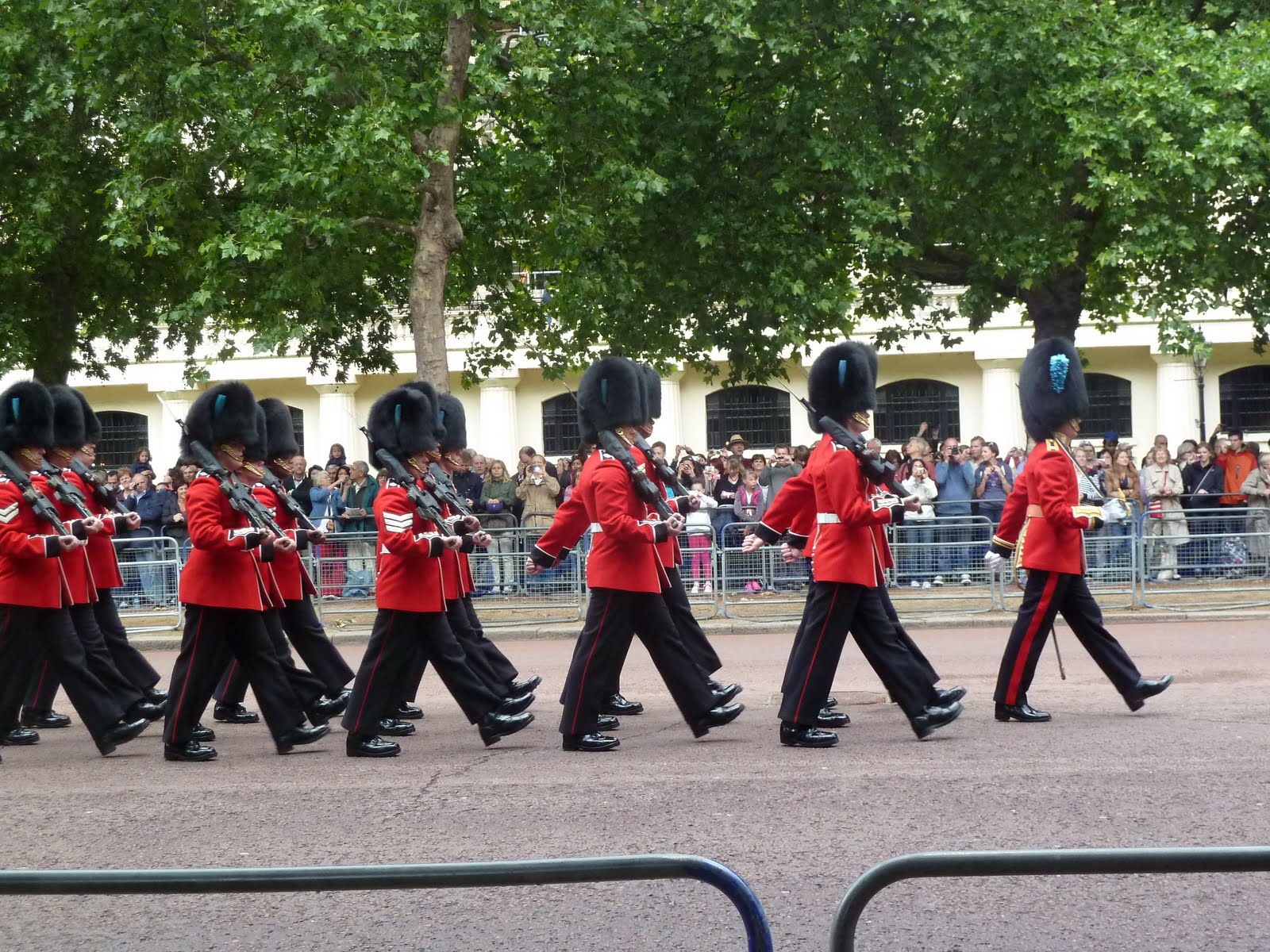 The Irish Guards can be identified by the blue plumes on their hats and by the arrangement of buttons on their tunics.